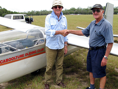 power pilot Mark Higgins is congratulated by Tony Sorenesen (left) after taking his first