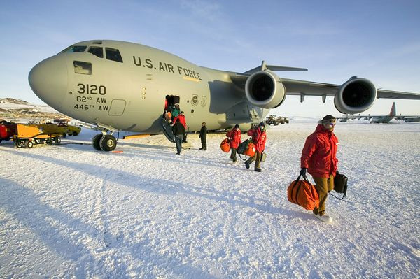 parka'd passengers disembark from a C-17 near